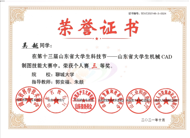 2020级优秀学生吴越,在第十三届山东省大学生科技节——山东省大学生机械CAD制图技能大赛中,荣获个人赛三等奖。